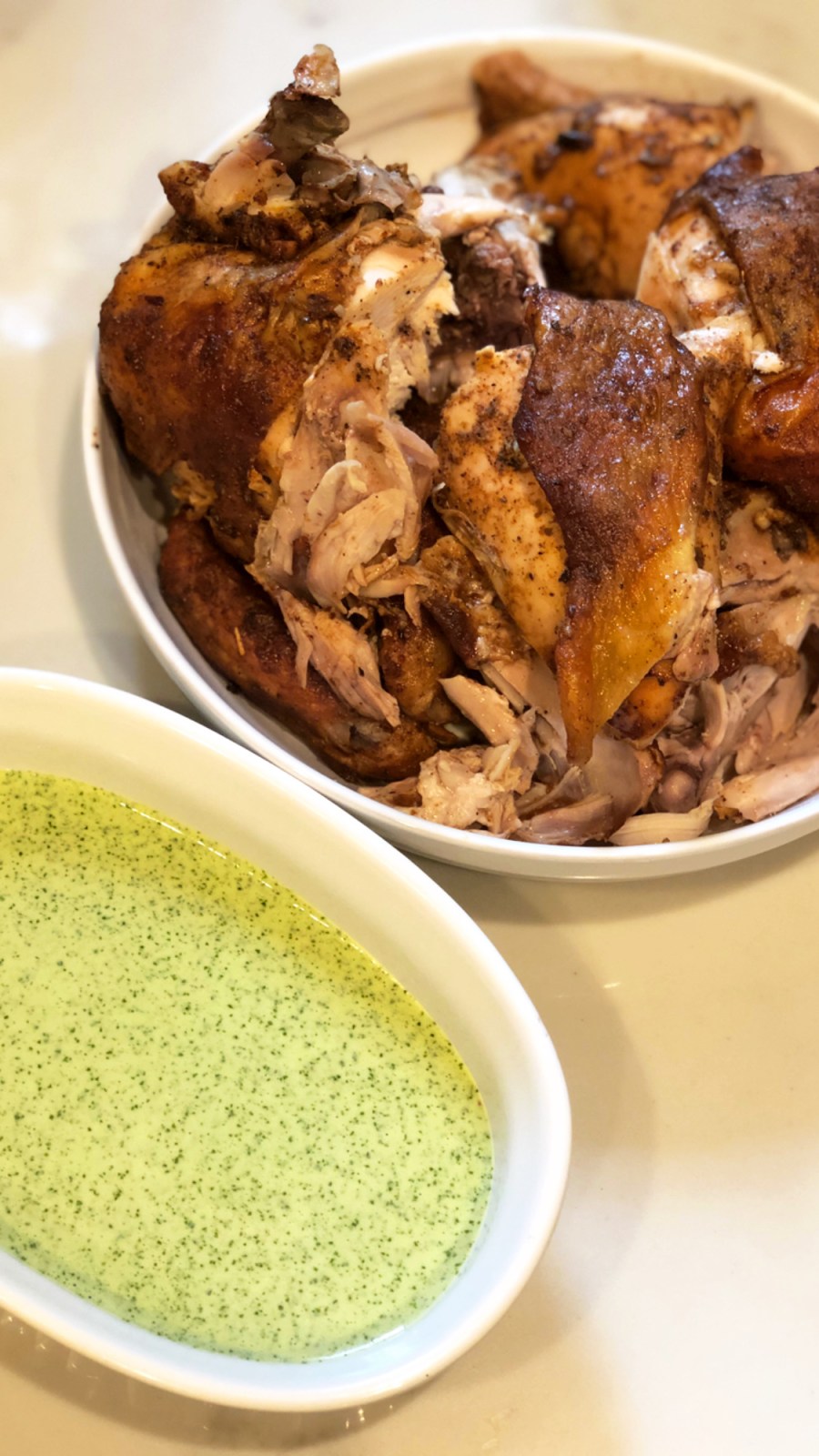 Peruvian chicken is juicy and packed with flavor and Aji Verde is the best dipping sauce to make this your go-to chicken recipe! (FYI, leftover Aji Verde is great with eggs!)